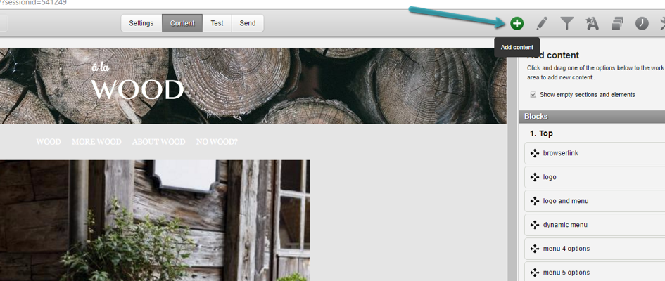 Tous les blocs disponibles sont visibles dans le menu à droite, dans “Affichage du contenu”. Vous pouvez revenir à ce menu à tout moment en appuyant sur le bouton vert +.
