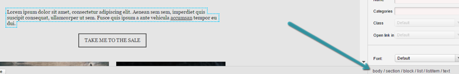Si vous souhaitez modifier l’arrière-plan complet de votre gabarit (et non pas seulement les blocs), vous pouvez le faire en sélectionnant n’importe quel élément dans le gabarit. En bas, dans le coin gauche, vous trouverez les breadcrumbs: